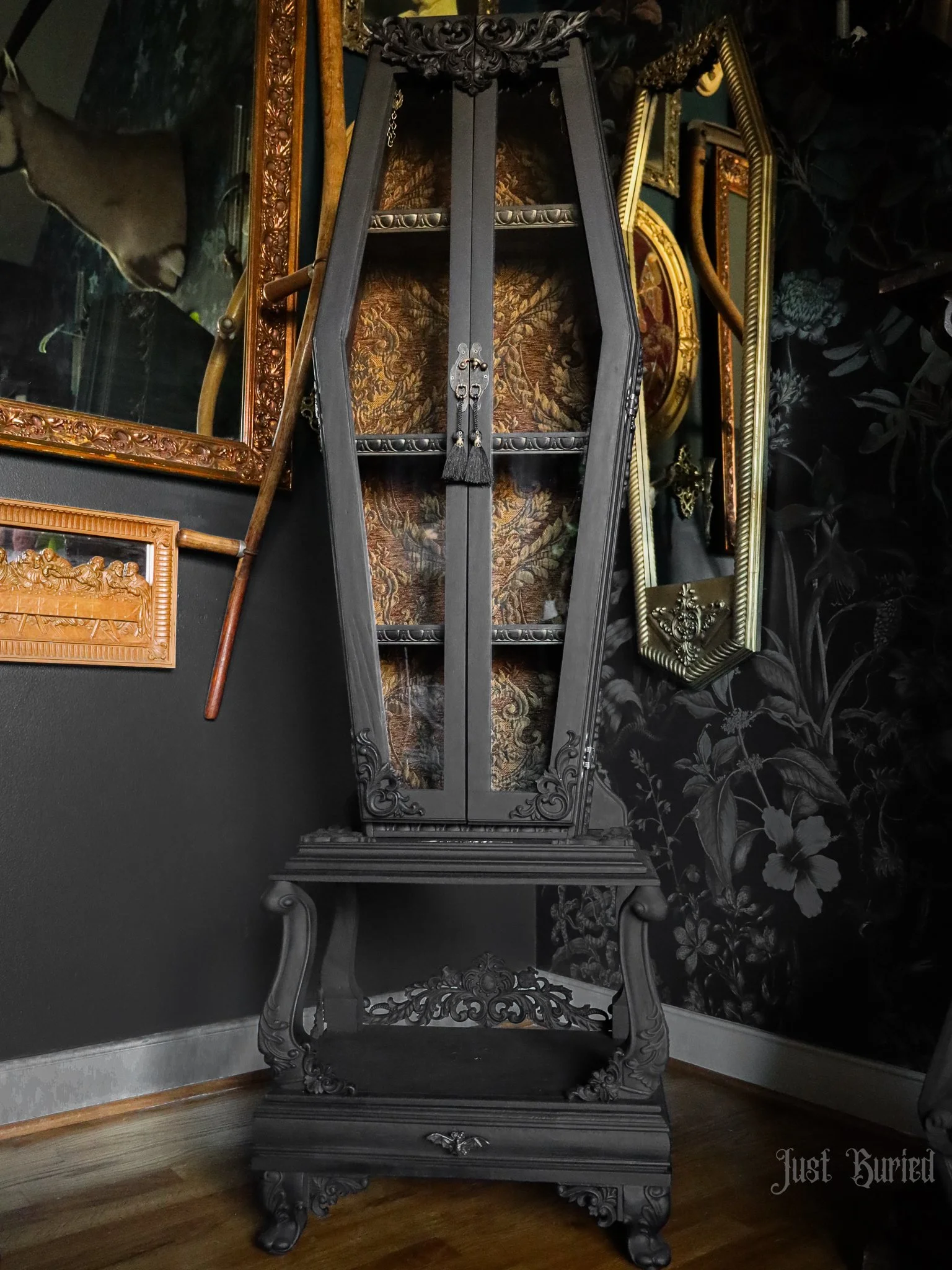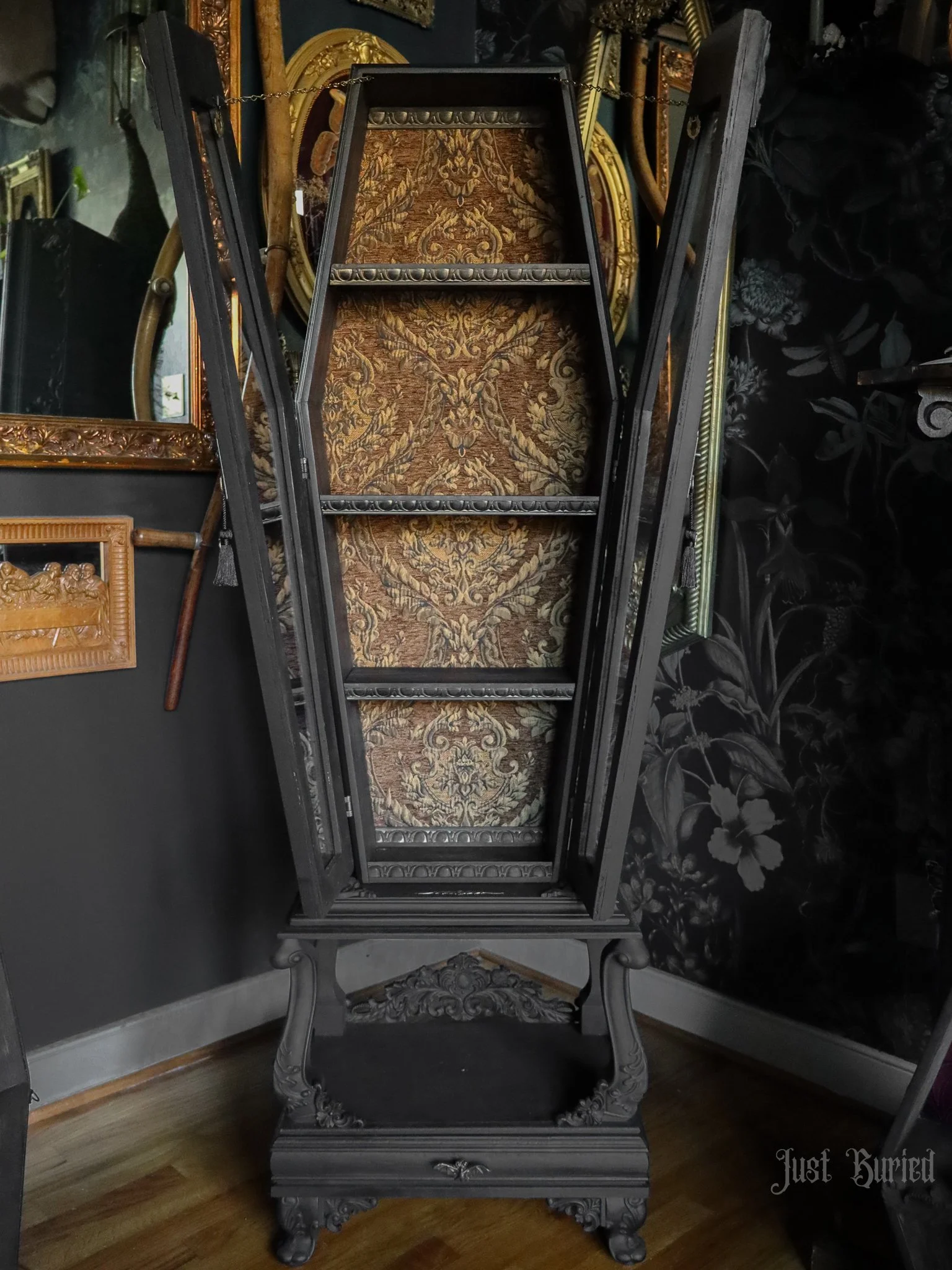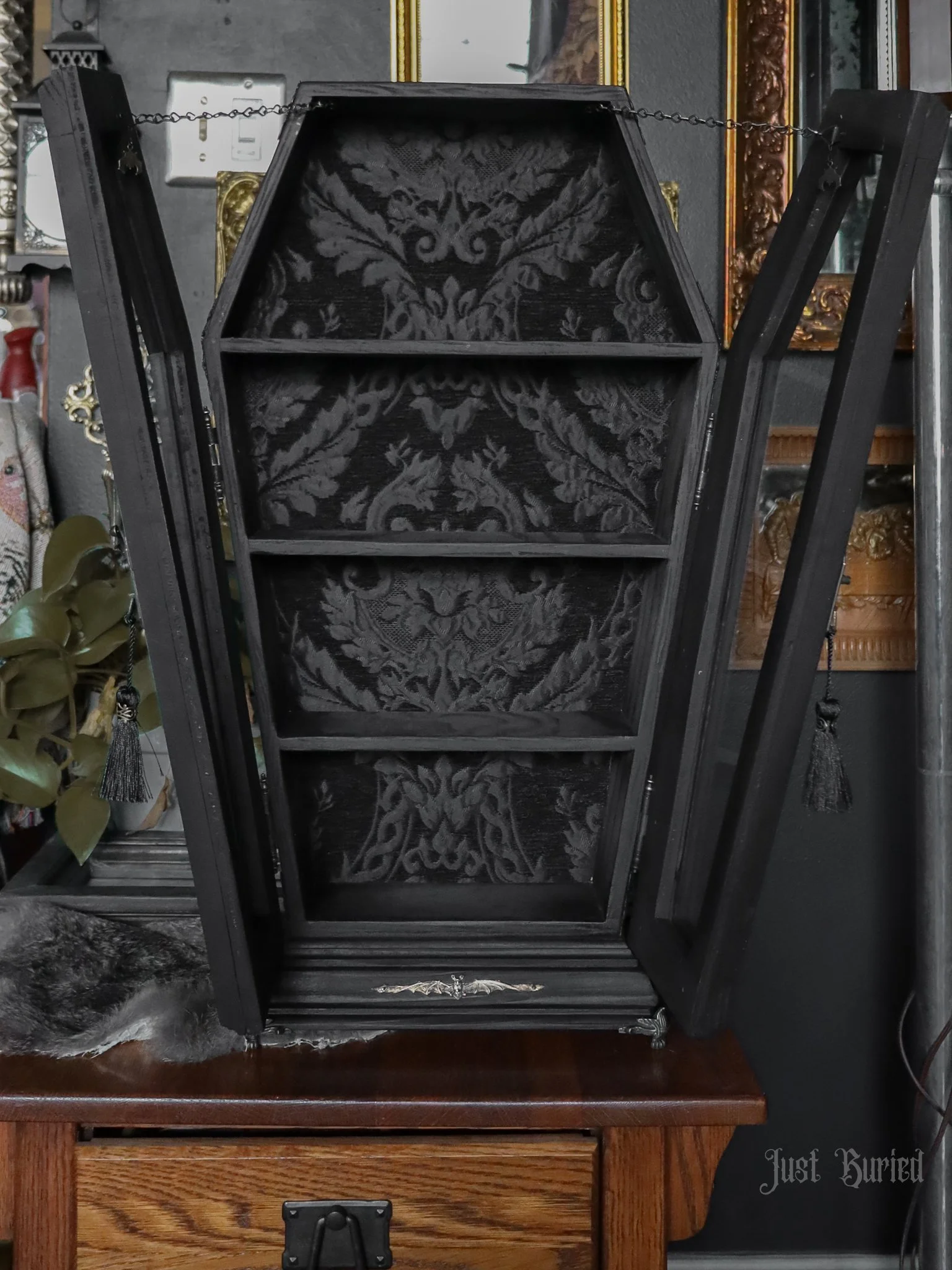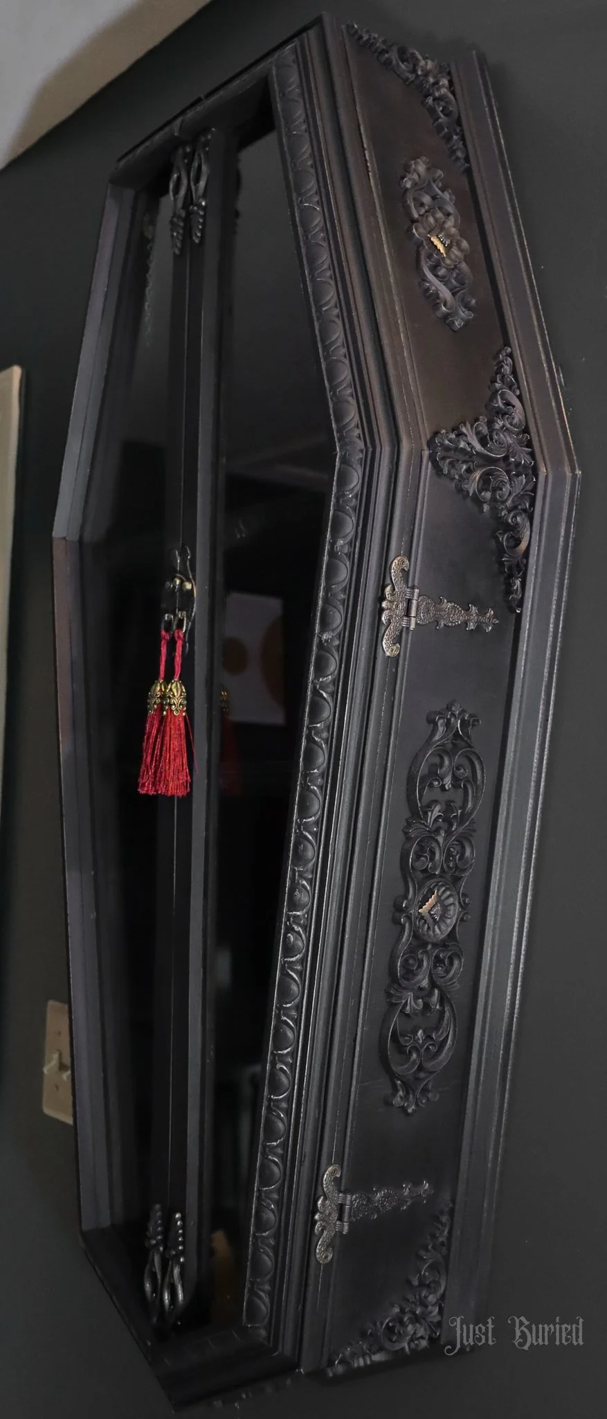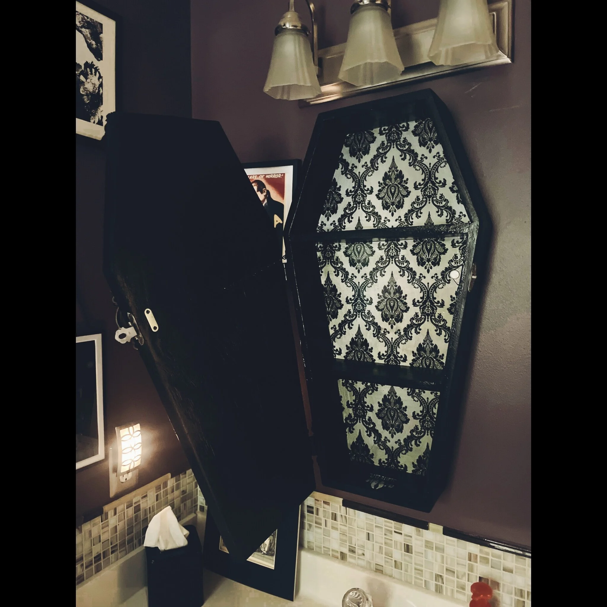 Gallery of our Mirrored Coffin Cabinet Vanities, Shelves, Curio Cabinets, and more!