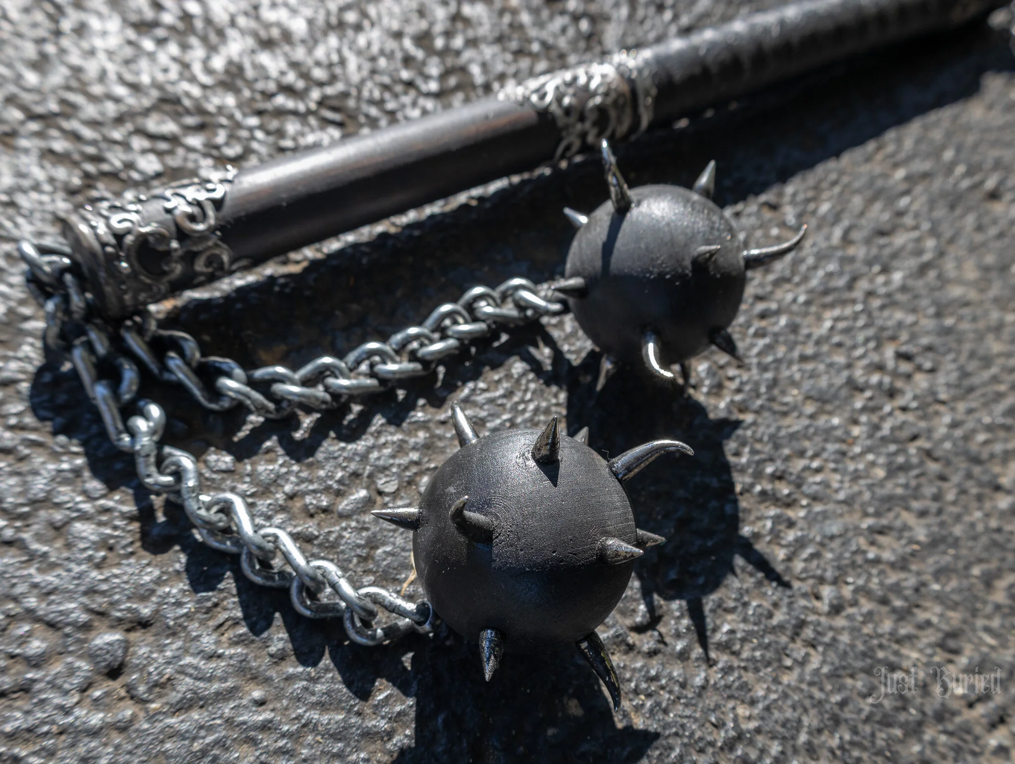 The Weapon (Double Headed Horseman’s Flail AKA The Equalizer) - This piece features a wooden handle, double wooden mace balls with decorative metal spikes, and double metal flail chain. Details in The Equalizer include ornate metal lace, and faux leather wrapped handle with brass bat accent.